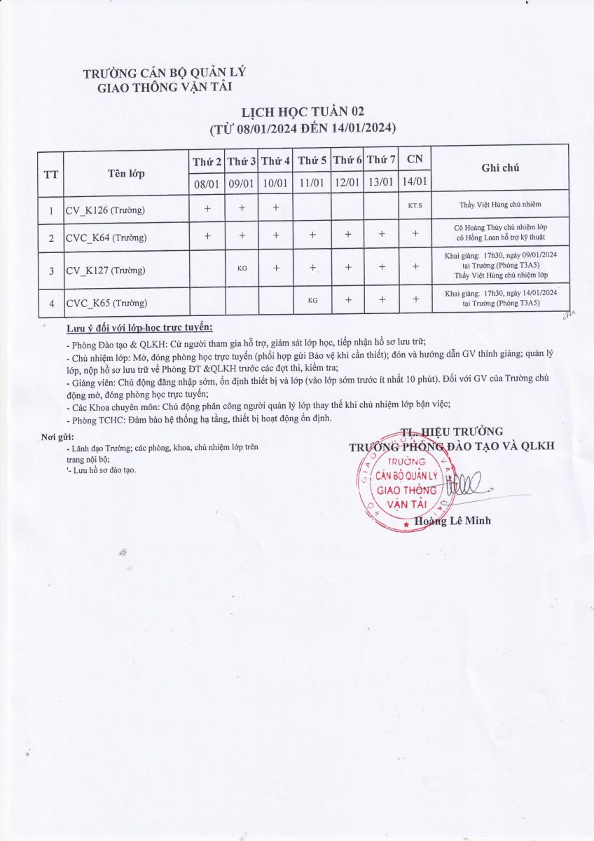 Lịch học tuần 02 từ 08/01/2024 đến 14/01/2024