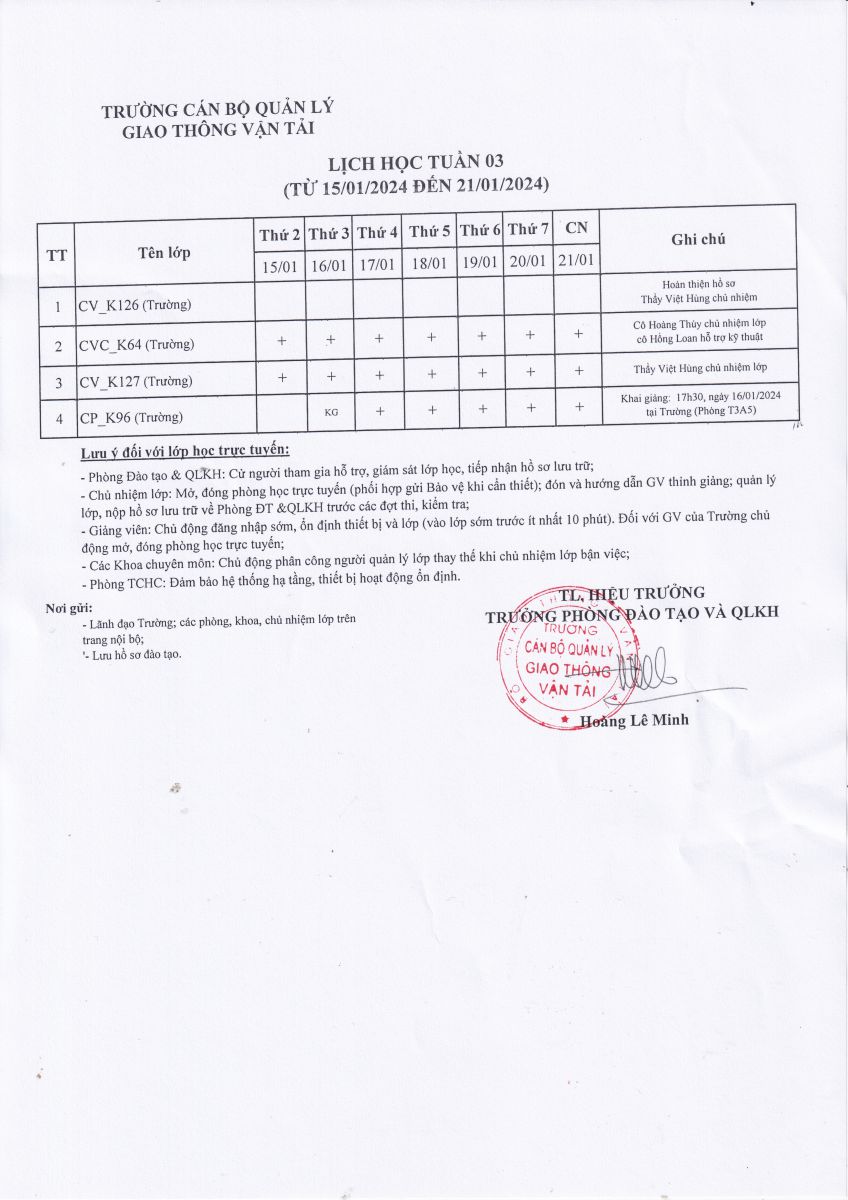 Lịch học tuần 03 từ 15/01/2024 đến 21/01/2024