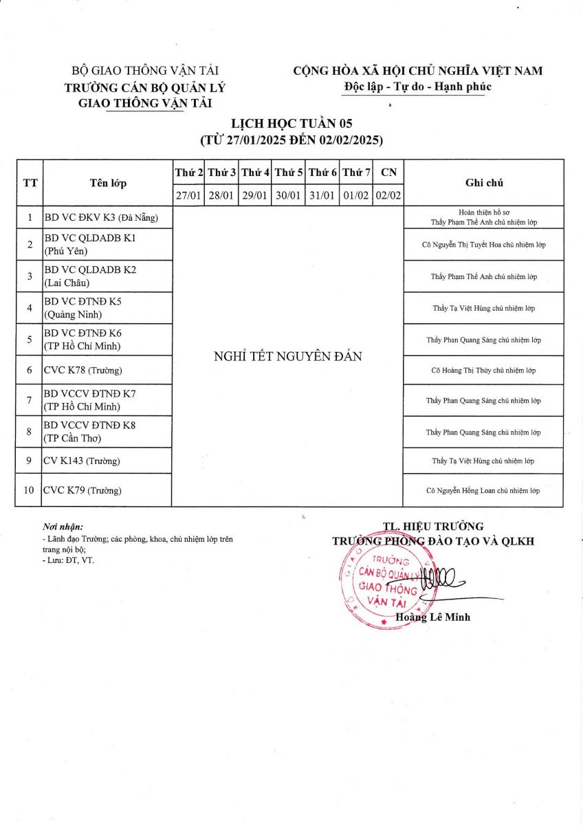 Lịch học tuần 05 từ 27/01/2025 đến 02/02/2025