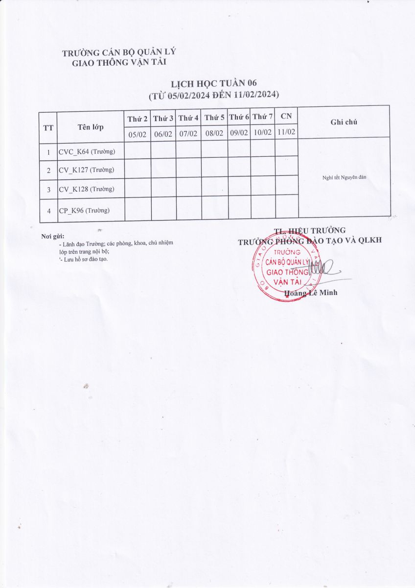 Lịch học tuần 06 từ 05/02/2024 đến 11/02/2024