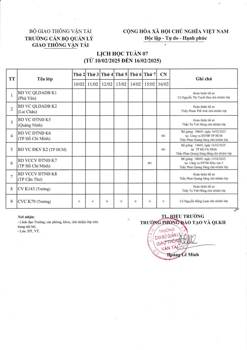 Lịch học tuần 07 từ 10/02/2025 đến 16/02/2025