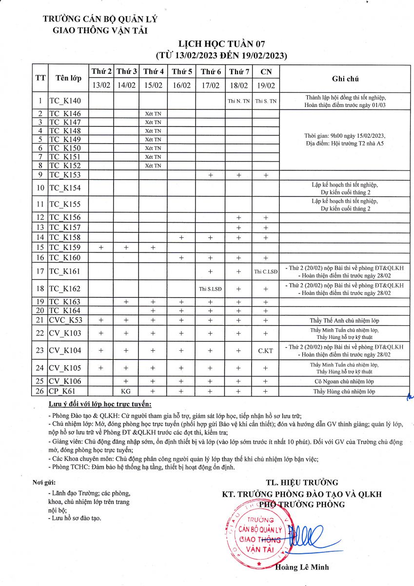 Lịch học tuần 07 từ 13/02/2023 đến 19/02/2023