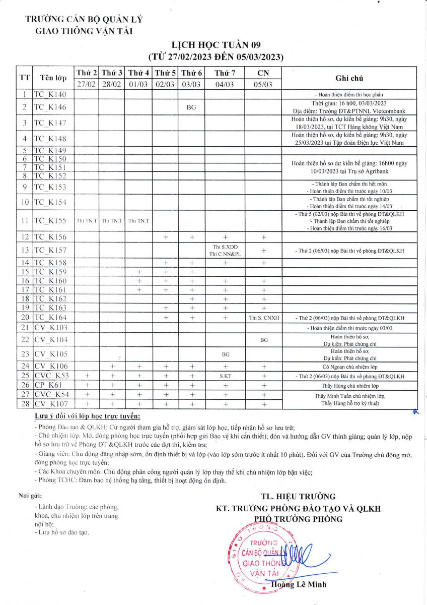 Lịch học tuần 09 (từ 27/02/2023 đến 05/3/2023)