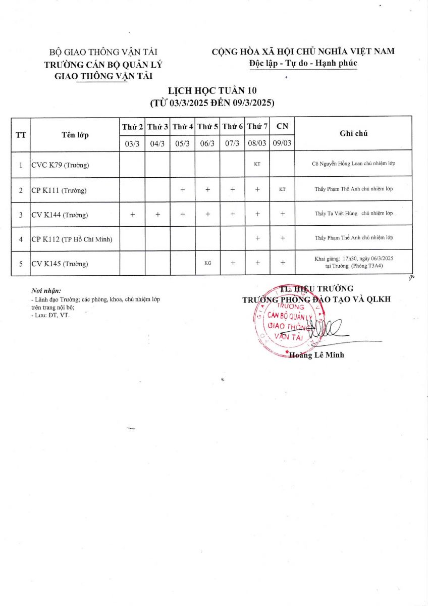 Lịch học tuần 10 từ 03/3/2025 đến 09/3/2025