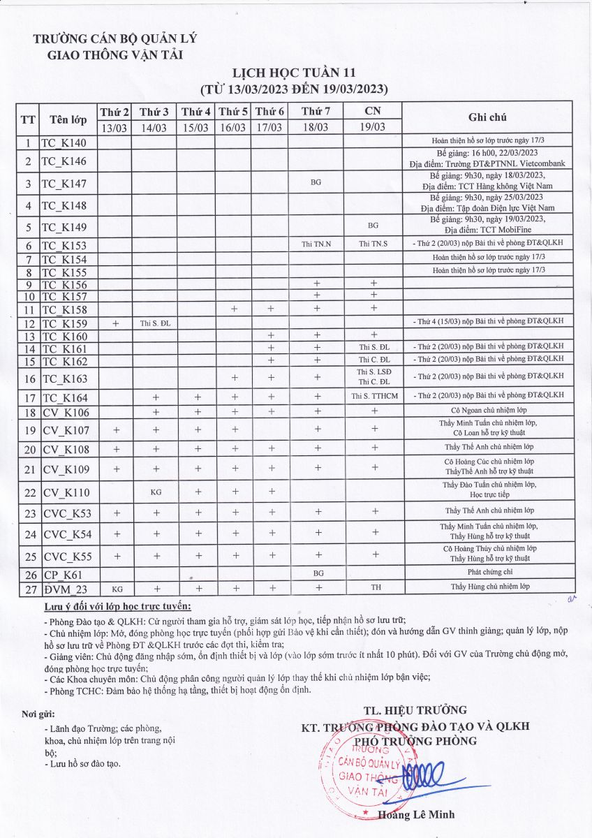 Lịch học tuần 11 (từ 13/3/2023 đến 19/3/2023)