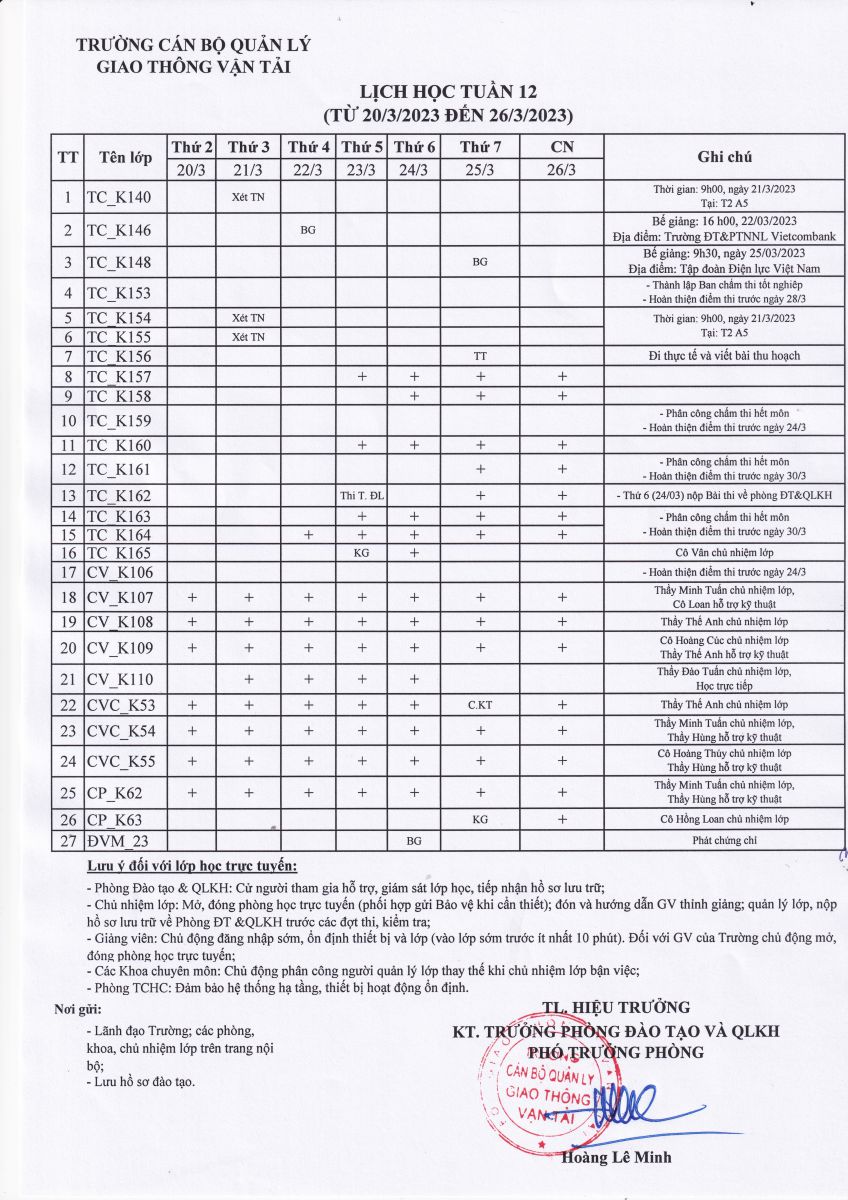 Lịch học tuần 12 (từ 20/3/2023 đến 26/3/2023)