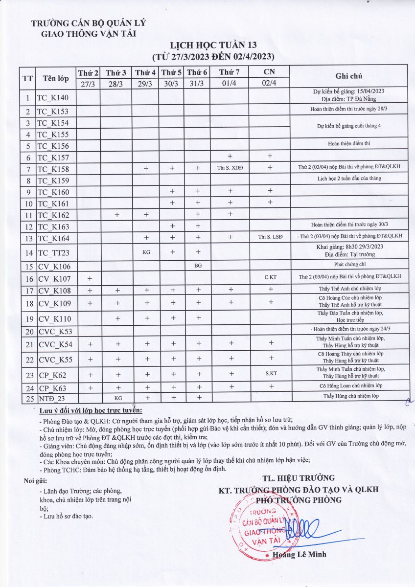 Lịch học tuần 13 (từ 27/3/2023 đến 02/4/2023)