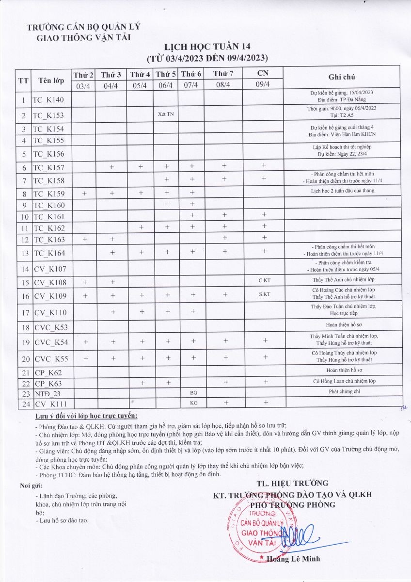 Lịch học tuần 14 (từ 03/4/2023 đến 09/4/2023)