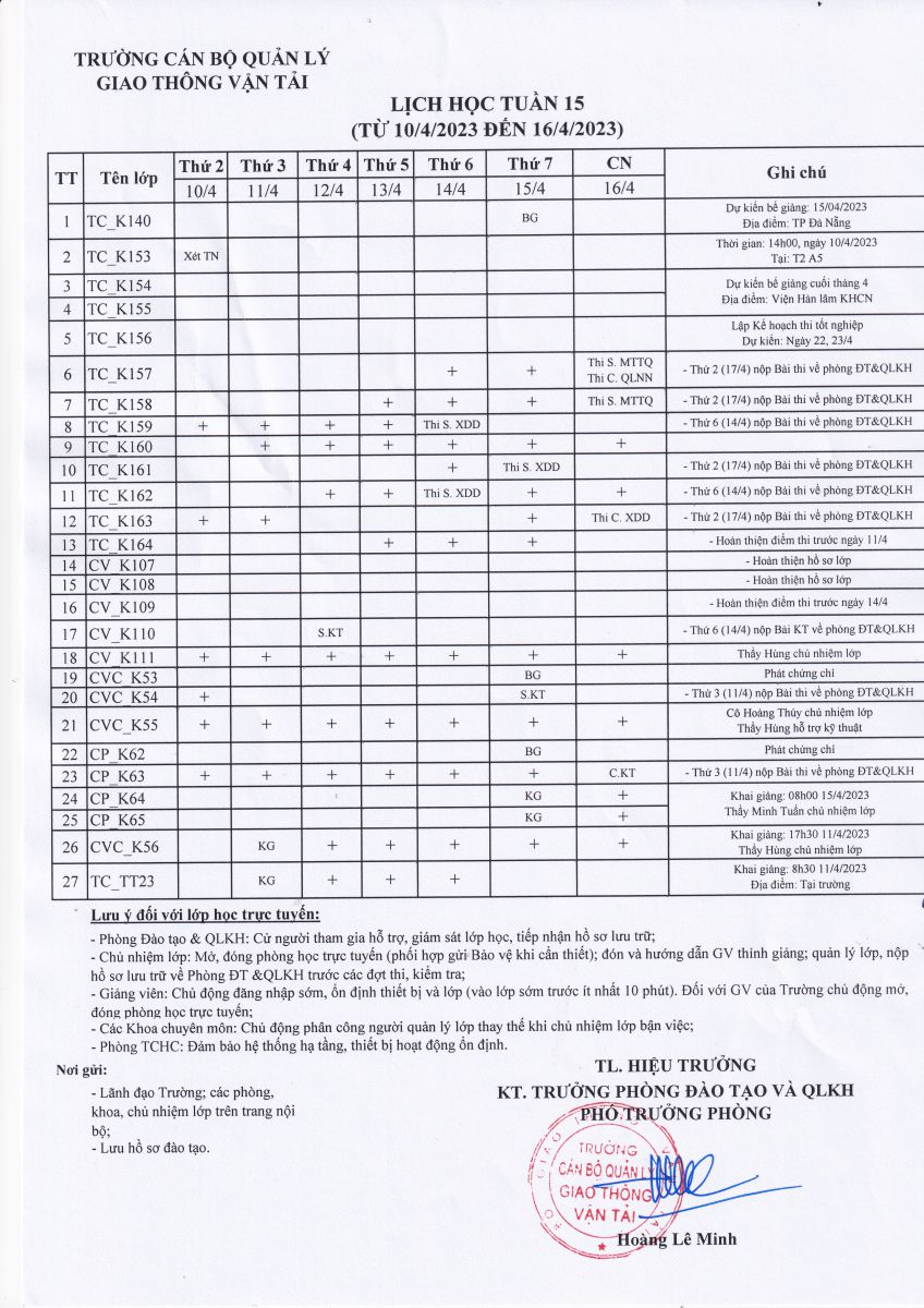 Lịch học tuần 15 (từ 10/4/2023 đến 16/4/2023)