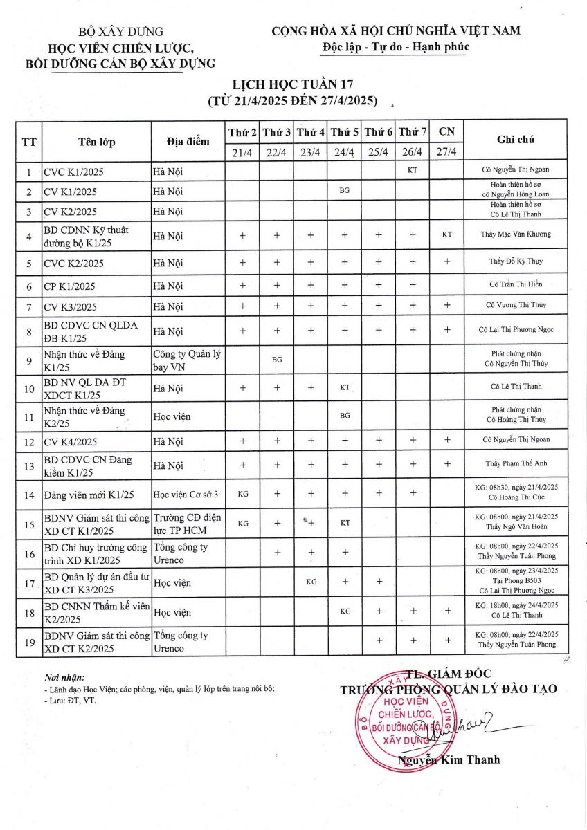 Lịch học tuần 17 từ 21/4/2025 đến 27/4/2025
