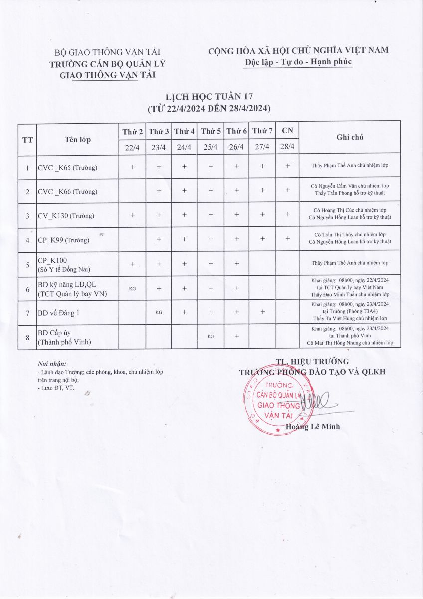 Lịch học tuần 17 từ 22/4/2024 đến 28/4/2024