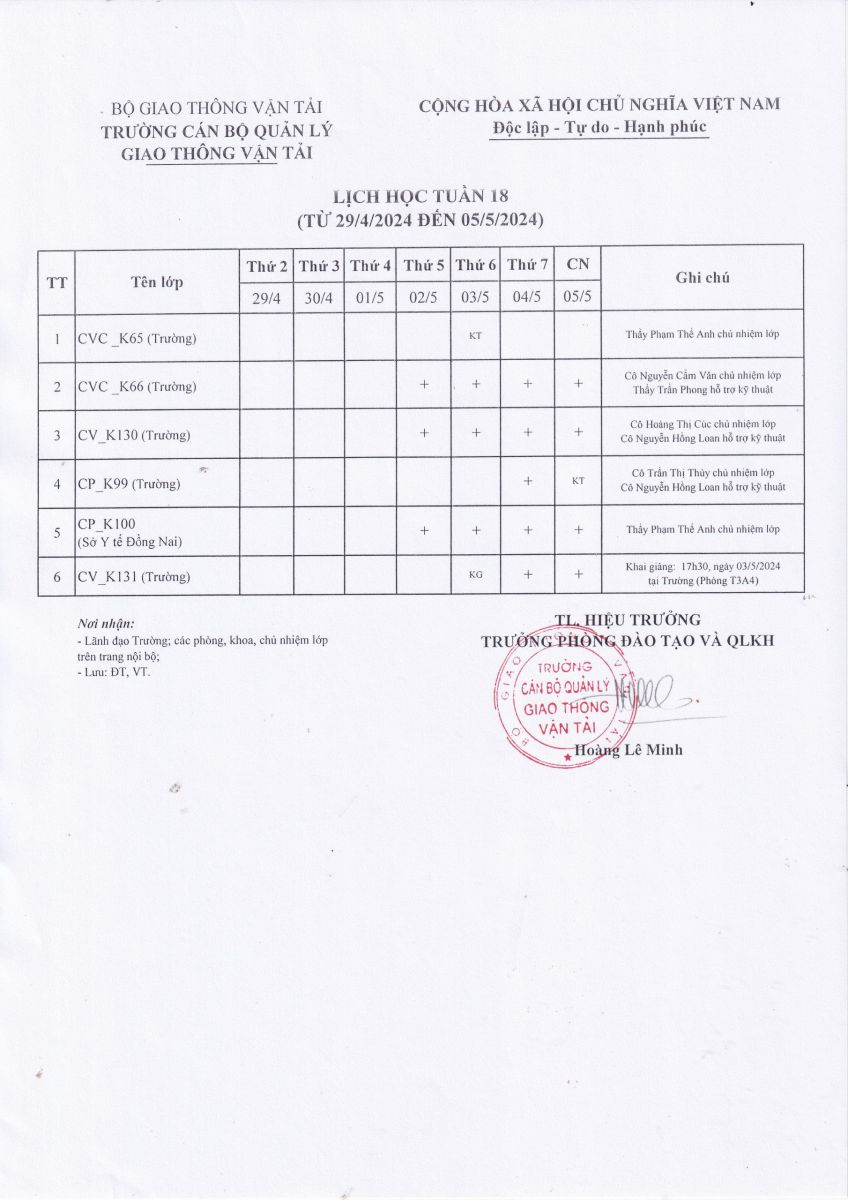 Lịch học tuần 18 từ 29/4/2024 đến 05/5/2024