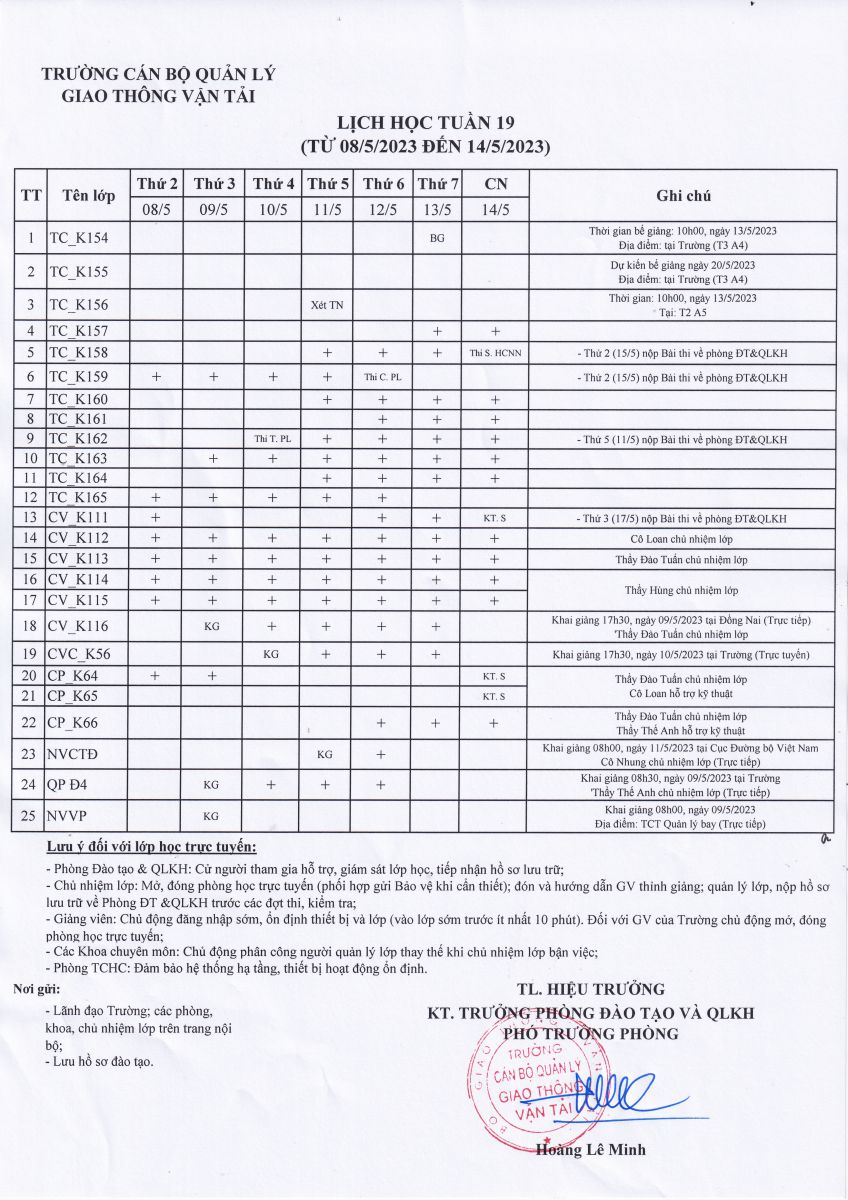Lịch học tuần 19 (từ 08/5/2023 đến 14/5/2023)