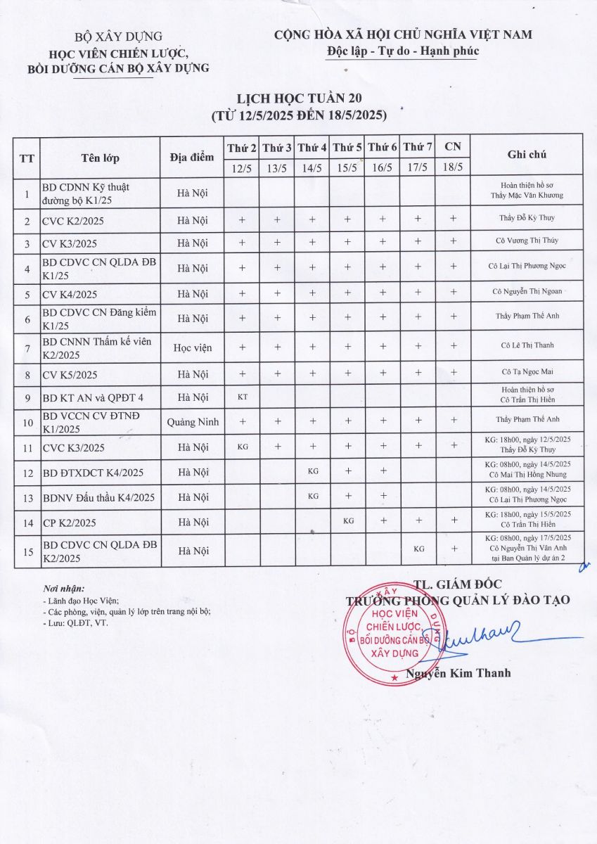 Lịch học tuần 20 từ 12/5/2025 đến 18/5/2025