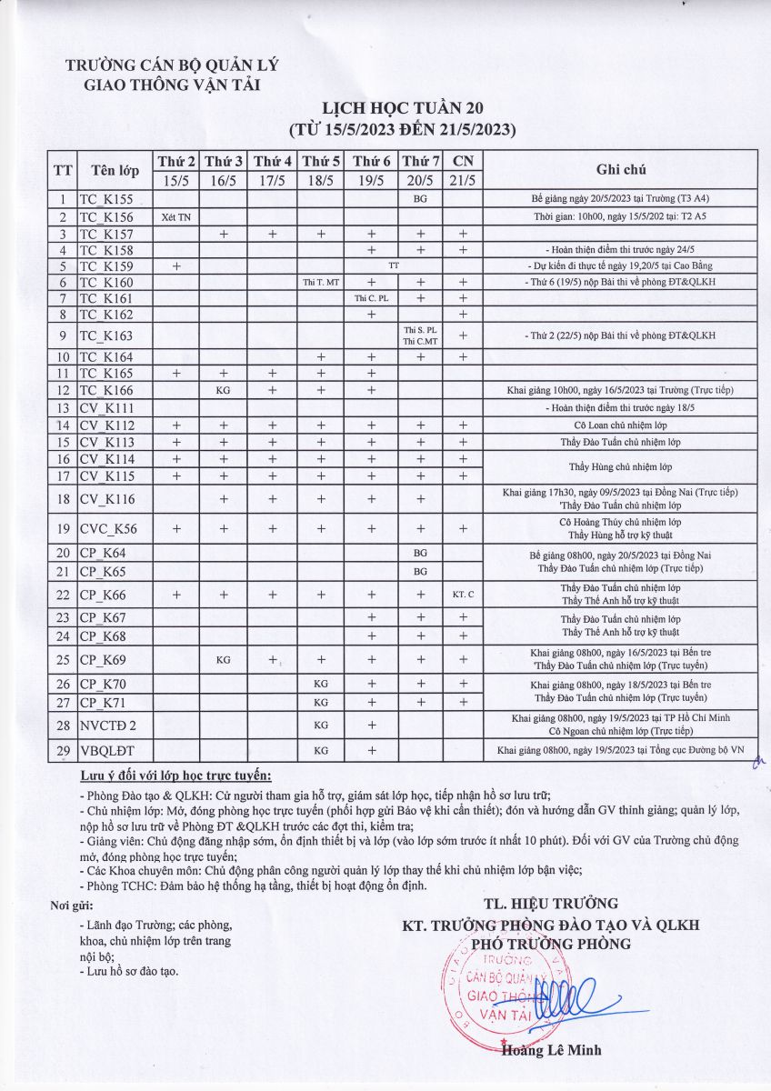 Lịch học tuần 20 (từ 15/5/2023 đến 21/5/2023)