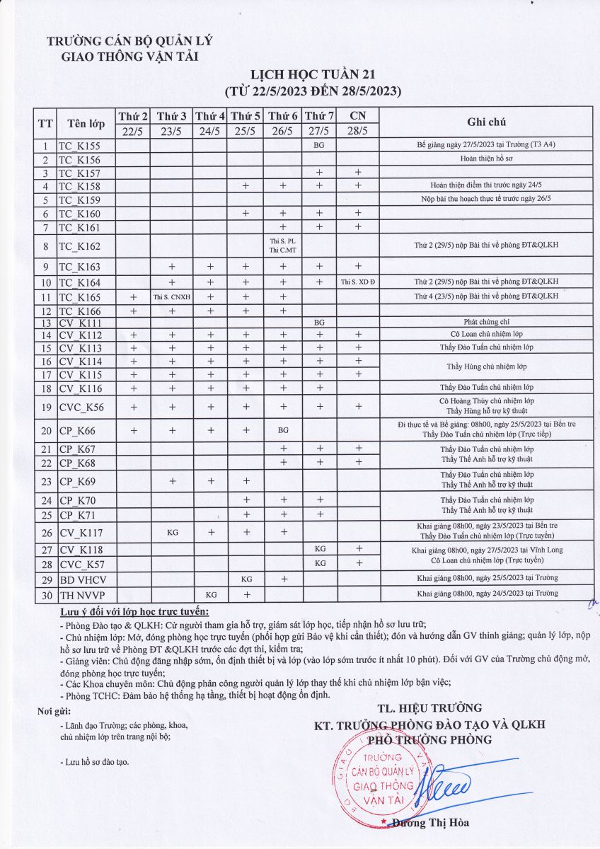 Lịch học tuần 21 (Từ 22/5/2023 đến 28/5/2023)