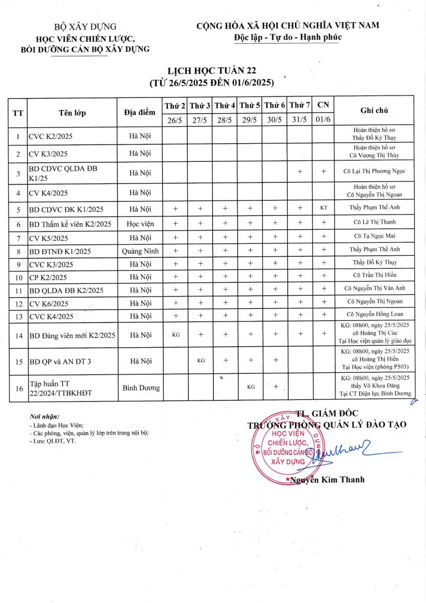 Lịch học tuần 22 từ 26/5/2025 đến 31/5/2025