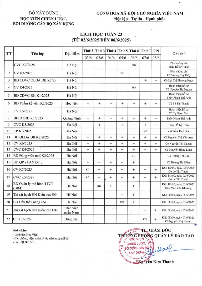 Lịch học tuần 23 từ 02/6/2025 đến 08/6/2025