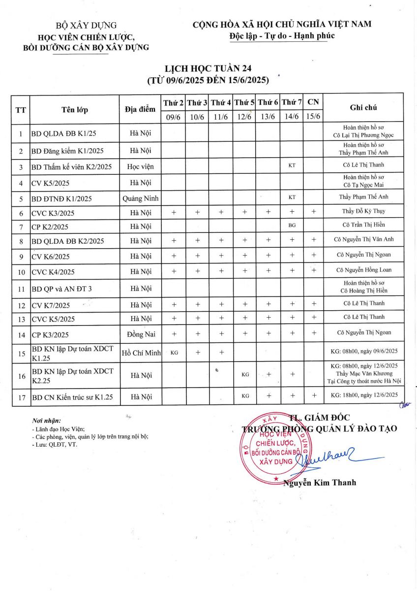 Lịch học tuần 24 từ 09/6/2025 đến 15/6/2025