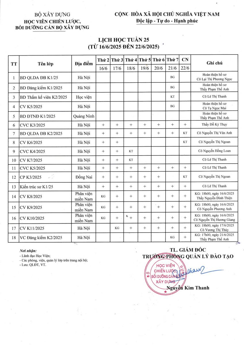 Lịch học tuần 25 từ 16/6/2025 đến 22/6/2025