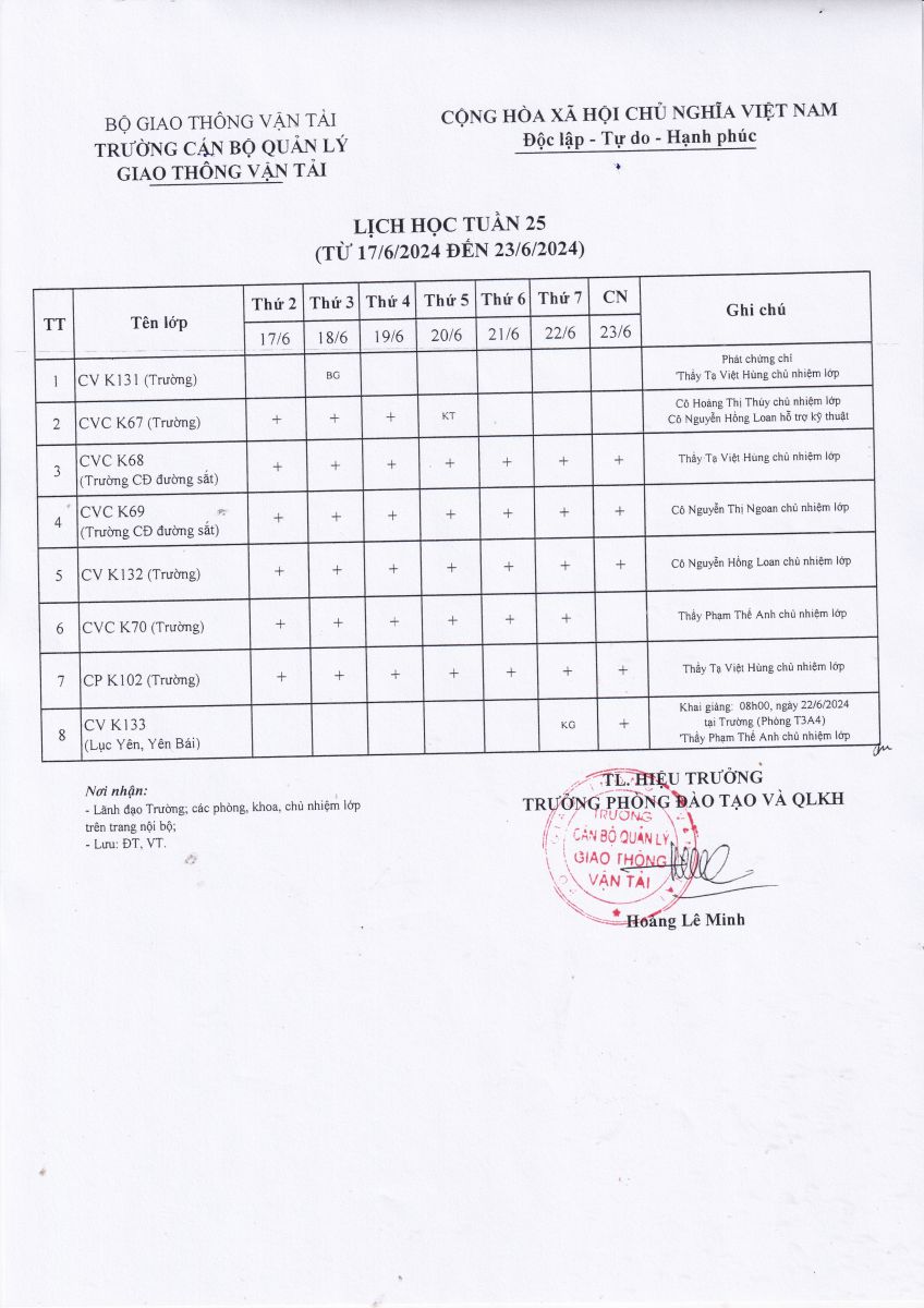 Lịch học tuần 25 từ 17/6/2024 đến 23/6/2024