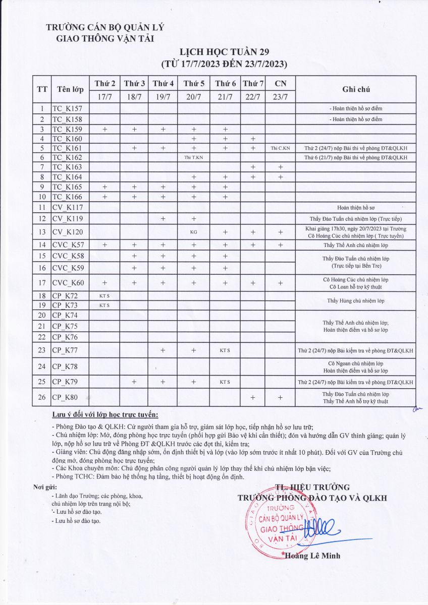 Lịch học tuần 29 (từ 17/7/2023 đến 23/7/2023)