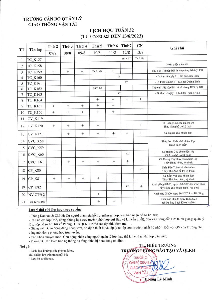 Lịch học tuần 32 (từ 07/8/2023 đến 13/8/2023)