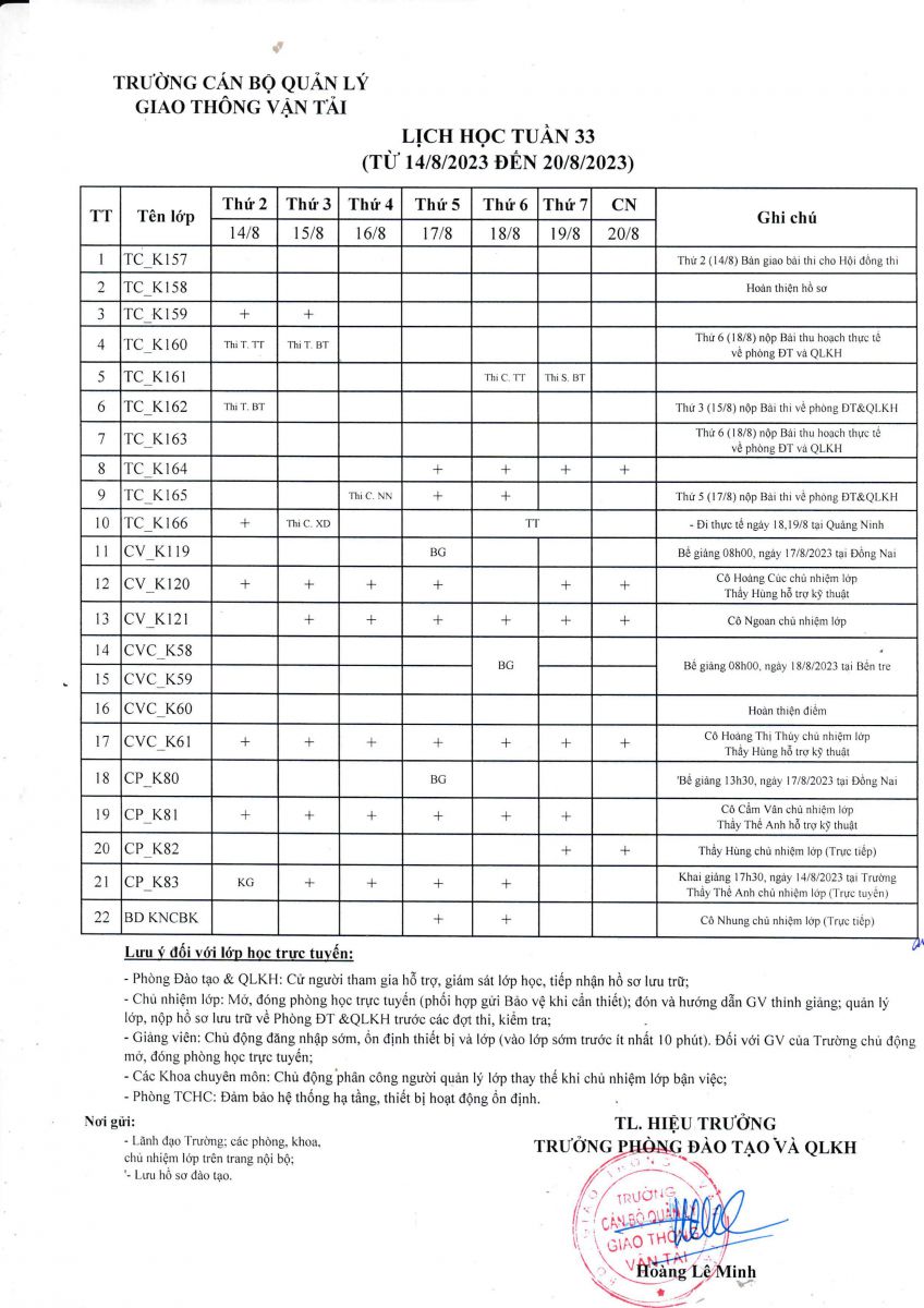 Lịch học tuần 33 (từ 14/8/2023 đến 20/8/2023)