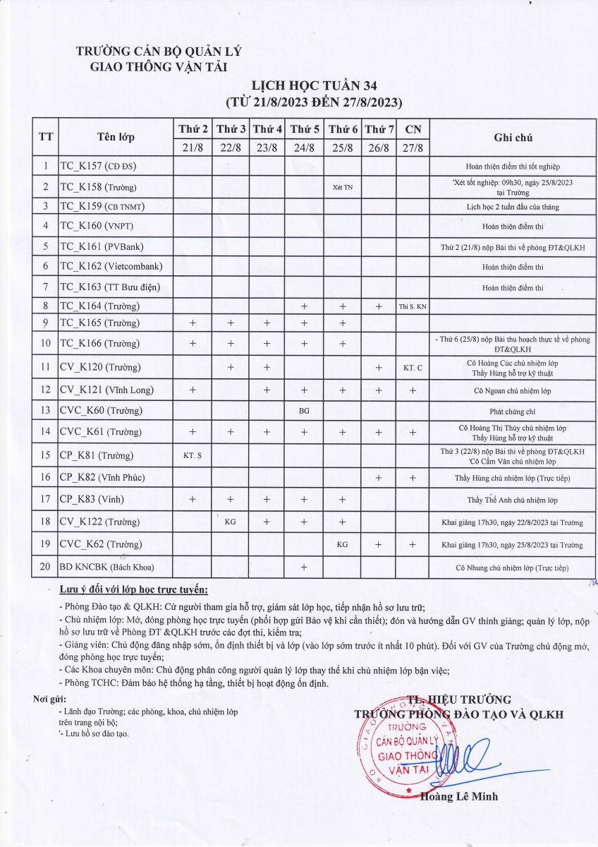 Lịch học tuần 34 (từ 21/8/2023 đến 27/8/2023)