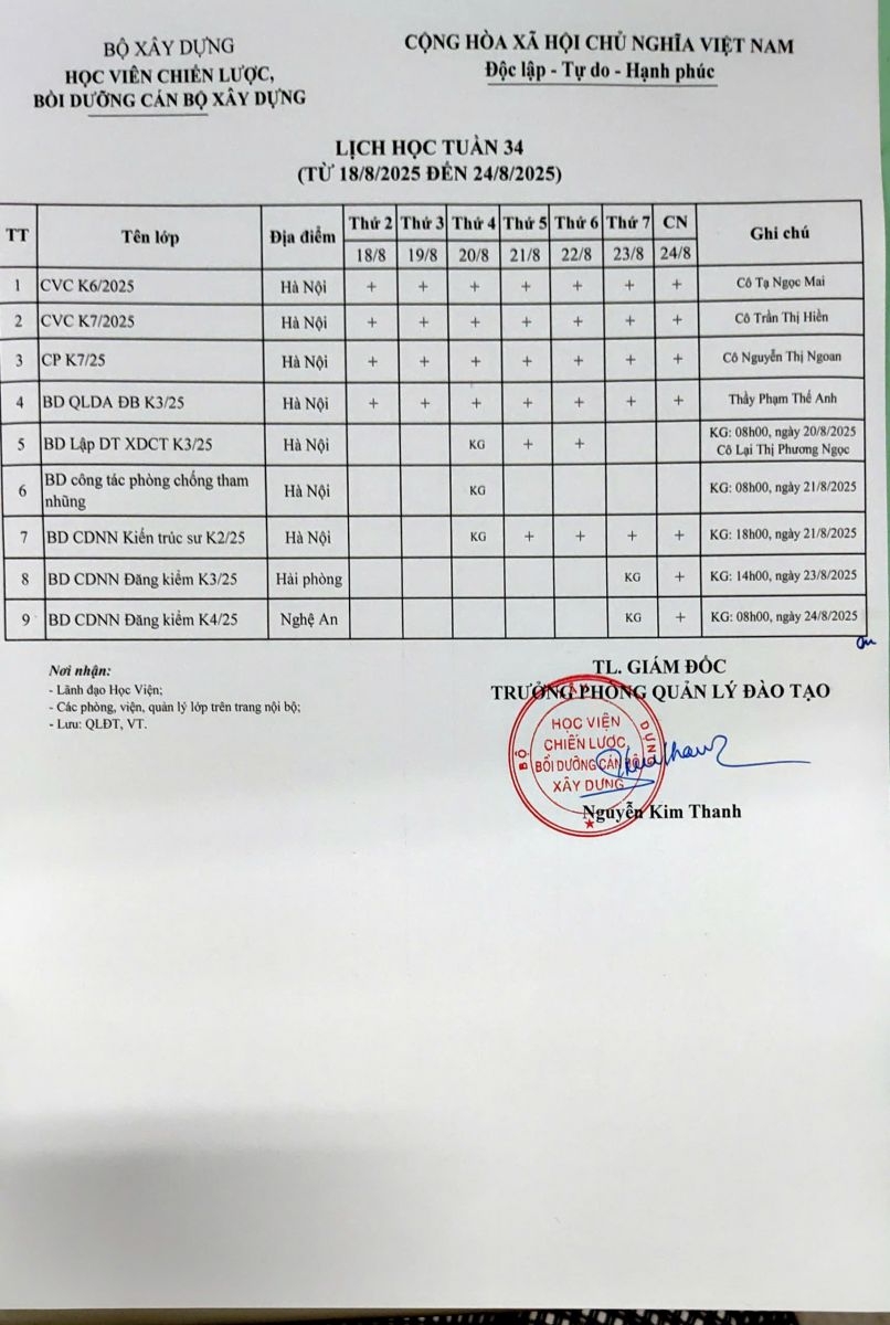 Lịch học tuần 34 từ 18/8/2025 đến 24/8/2025