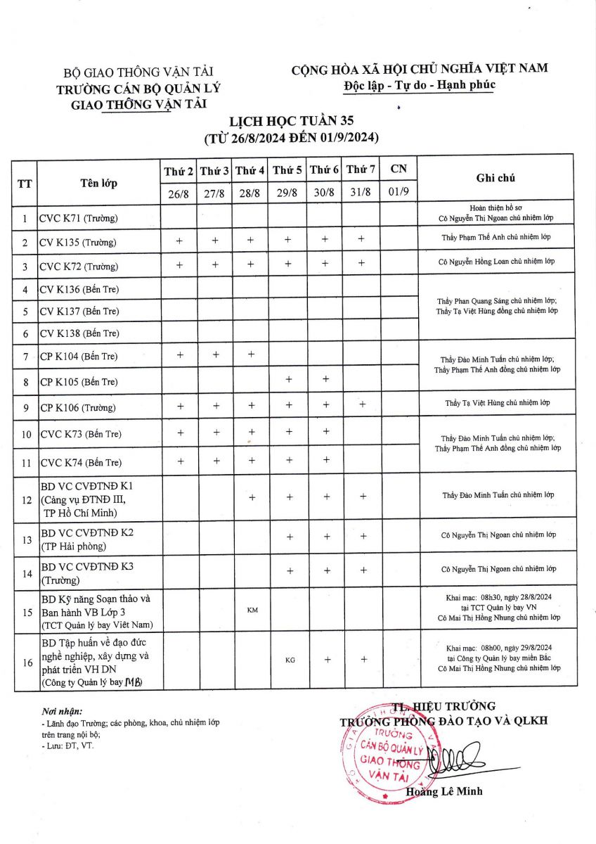 Lịch học tuần 35 từ 26/8/2024 đến 01/9/2024