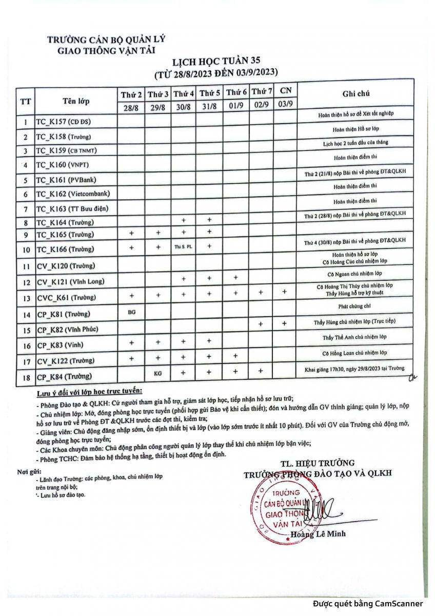 Lịch học tuần 35 từ 28/8/2023 đến 03/9/2023