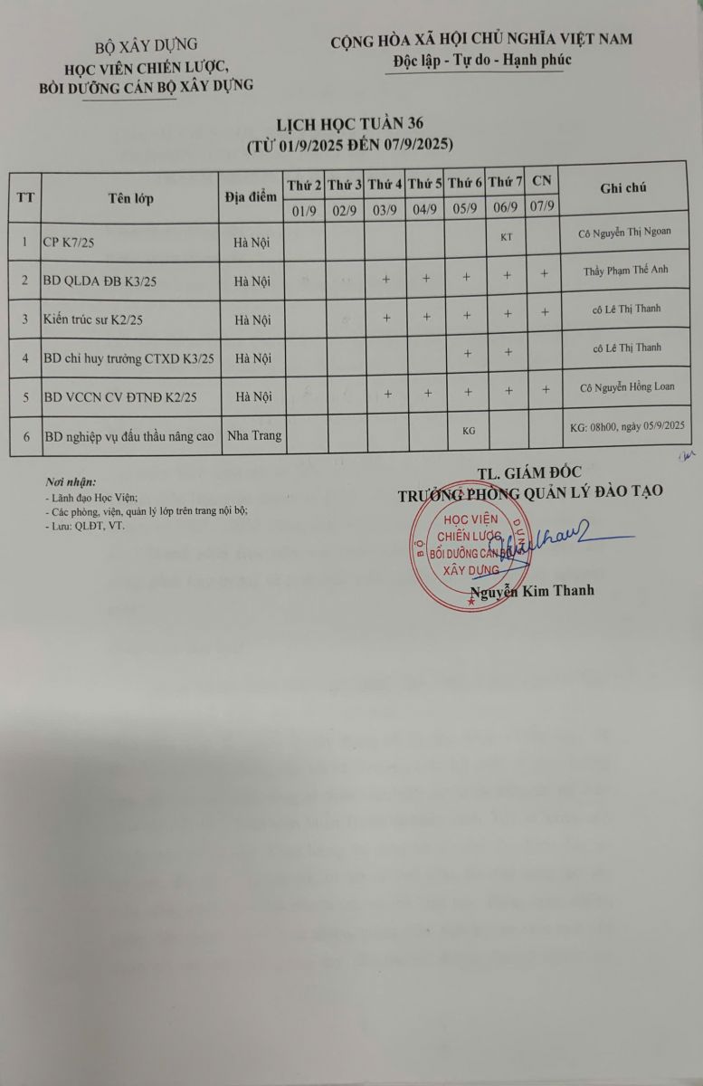Lịch học tuần 36 từ 1/9/2025 đến 7/9/2025