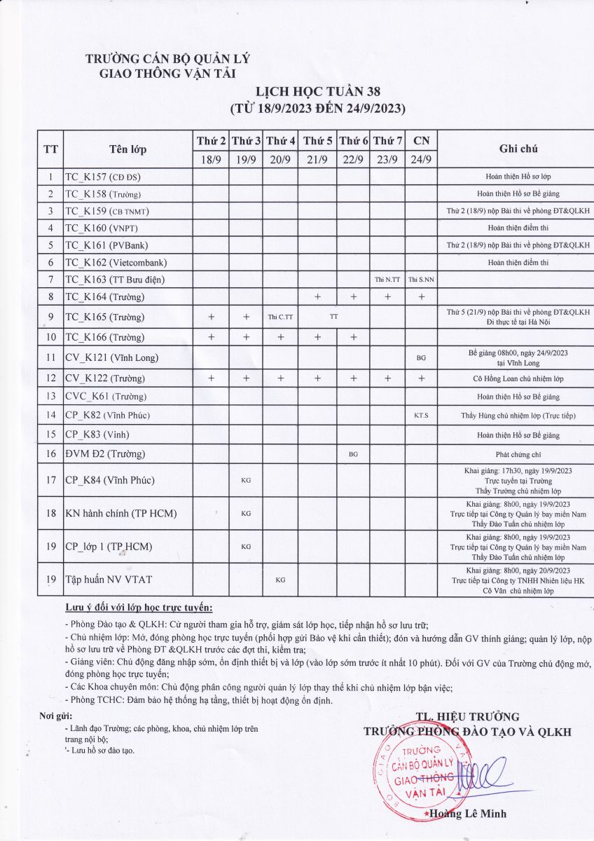 Lịch học tuần 38 (từ 18/9/2023 đến 24/9/2023)