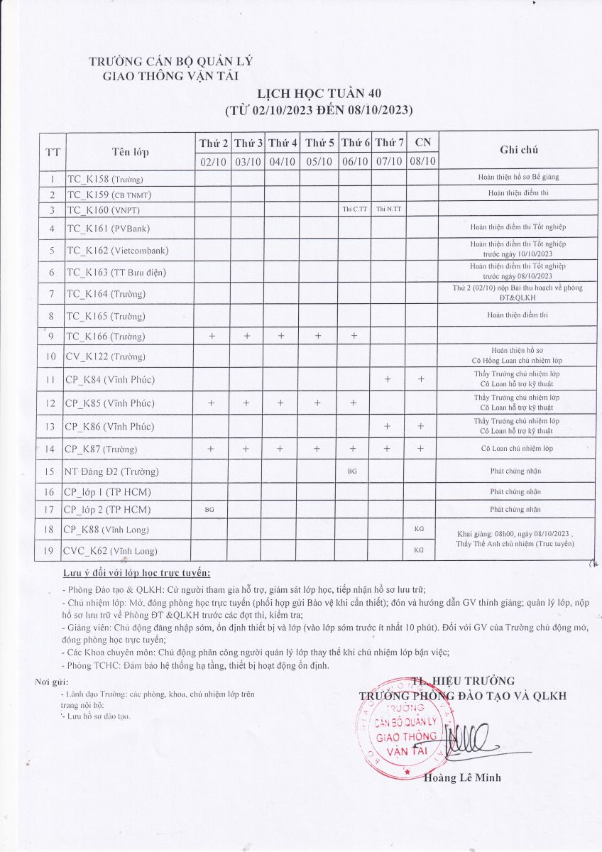 Lịch học tuần 40 (từ 02/10/2023 đến 08/10/2023)