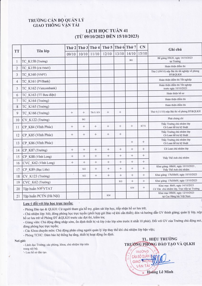 Lịch học tuần 41 (từ 09/10/2023 đến 15/10/2023)