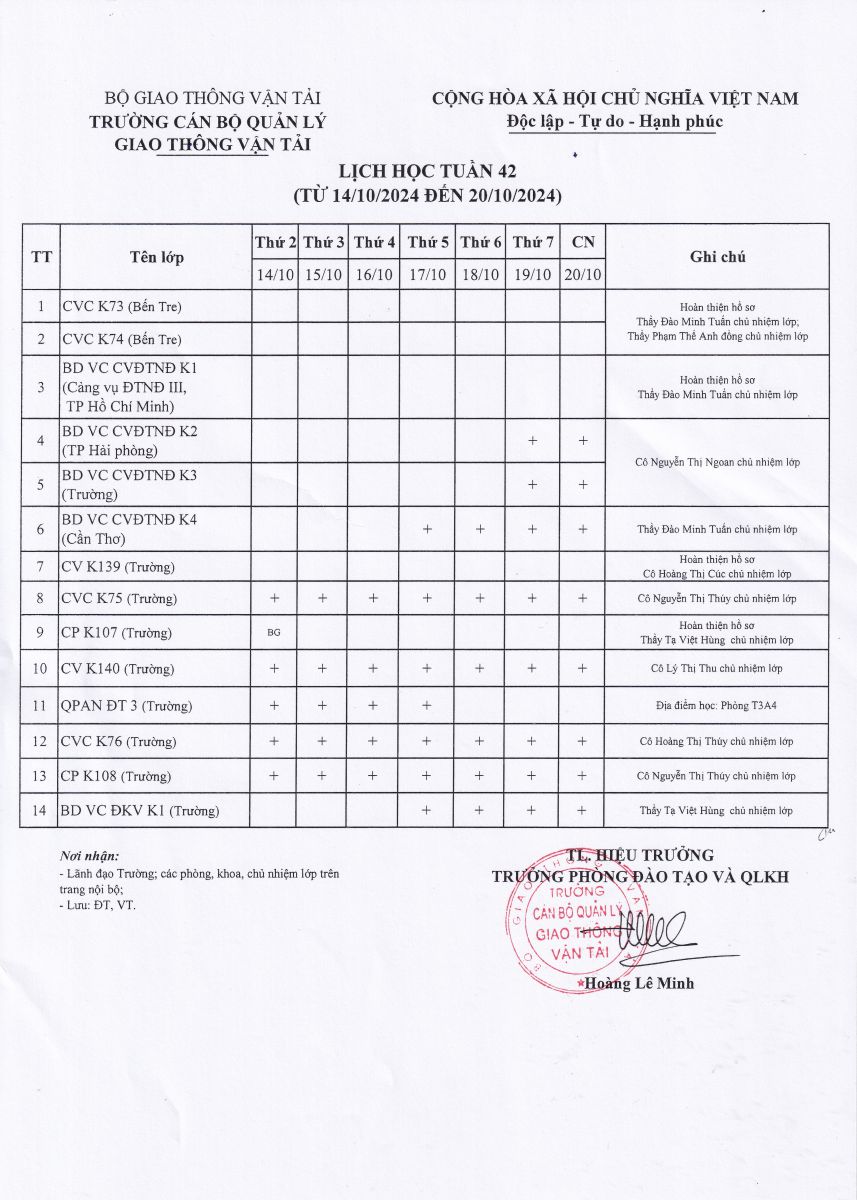 Lịch học tuần 42 từ 14/10/2024 đến 20/10/2024