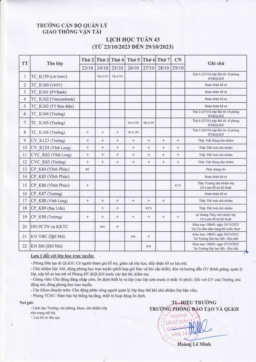 Lịch học tuần 43 (từ 23/10/2023 đến 29/10/2023)