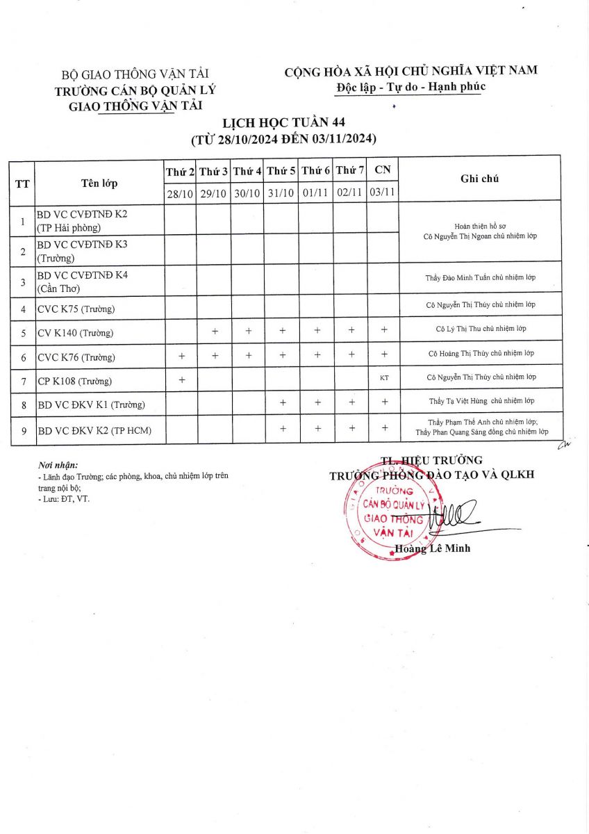 Lịch học tuần 44 từ 28/10/2024 đến 03/11/2024