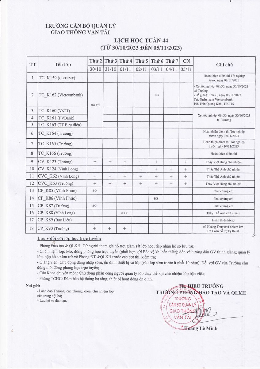 Lịch học tuần 44 (từ 30/10/2023 đến 05/11/2023)