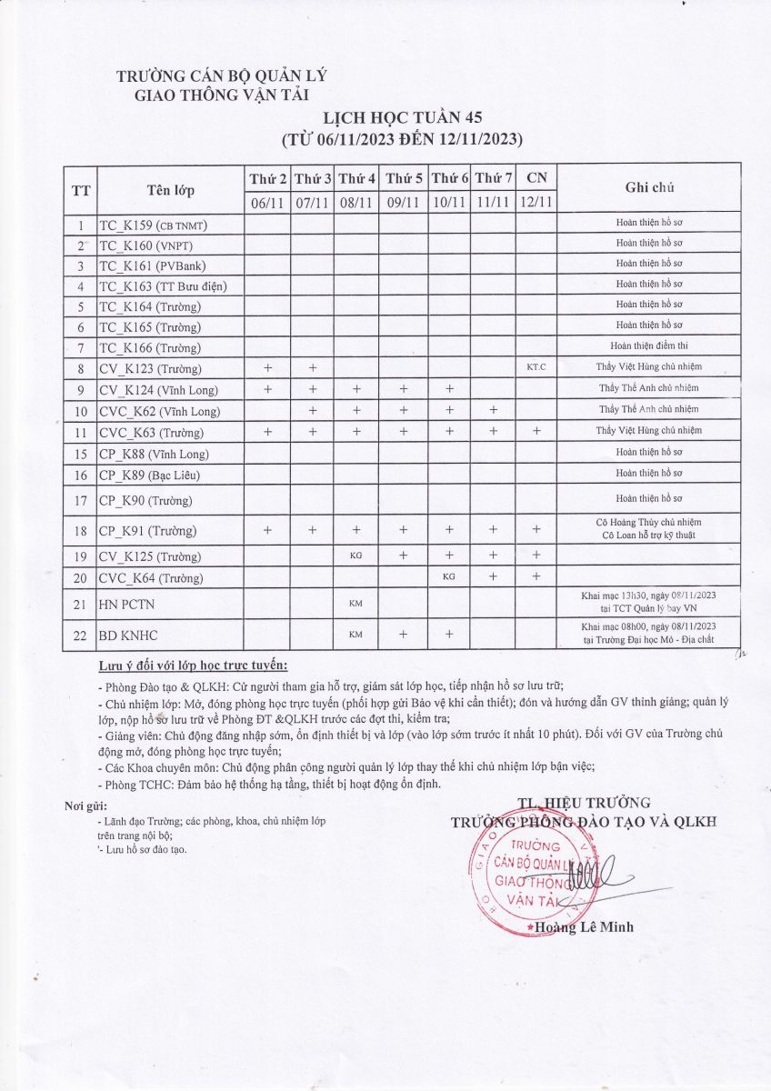 Lịch học tuần 45 (từ 06/11/2023 đến 12/11/2023)