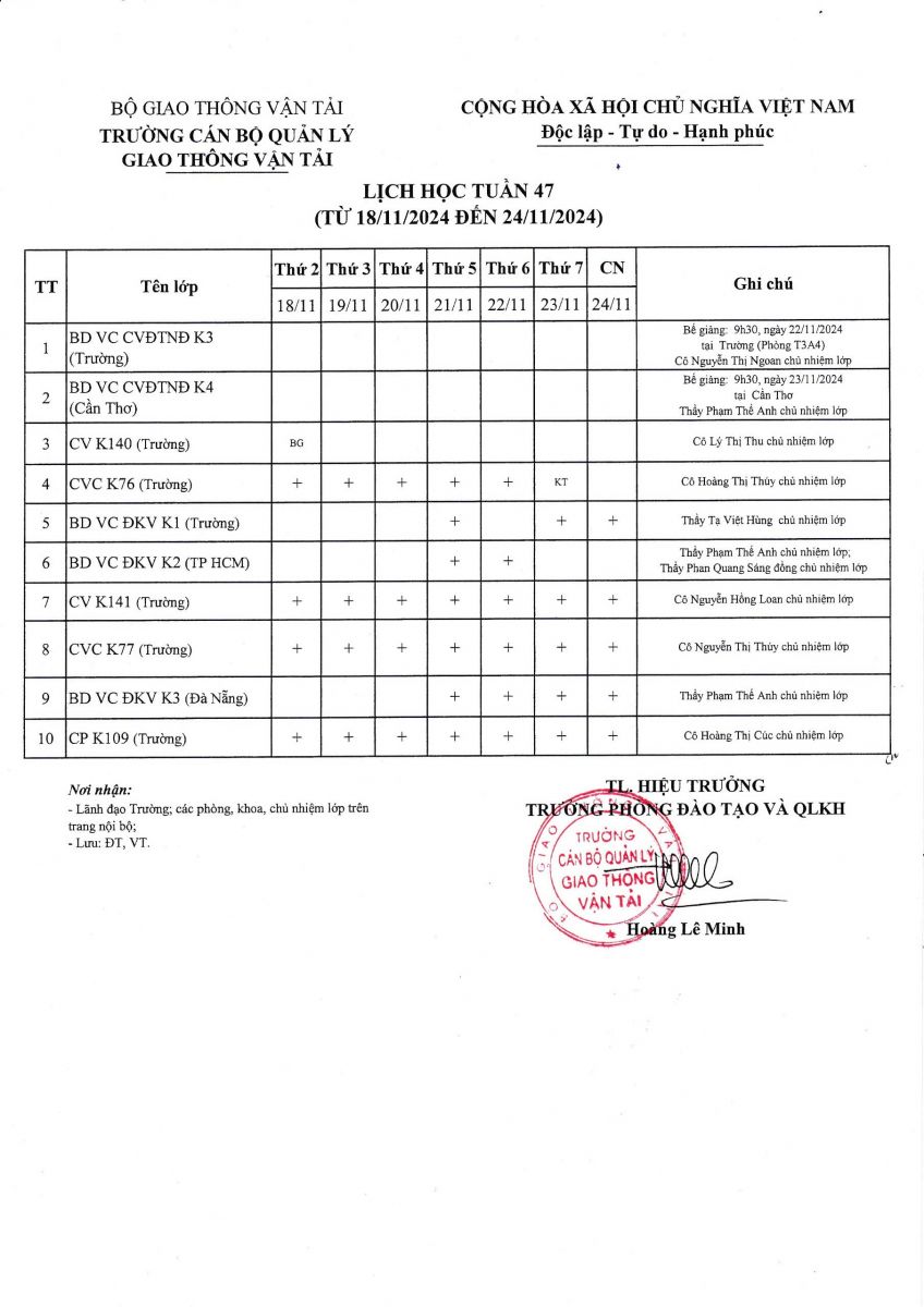 Lịch học tuần 47 từ 18/11/2024 đến 24/11/2024