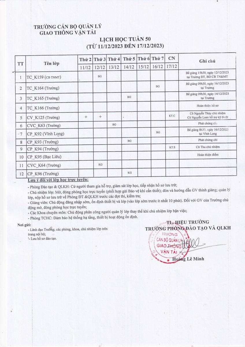 Lịch học tuần 50 (Từ 11/12/2023 đến 17/12/2023