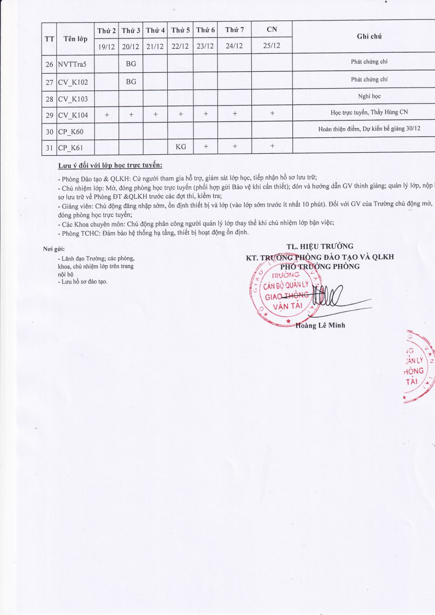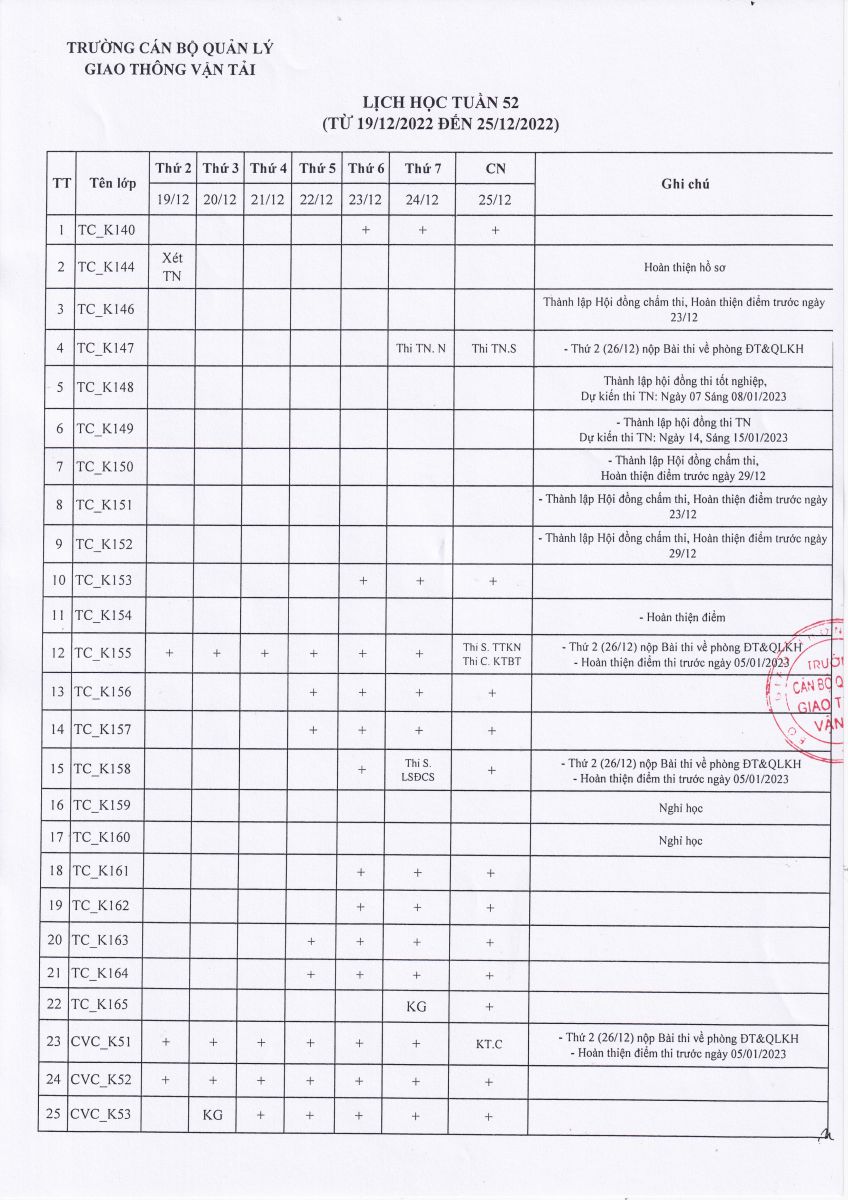 Lịch học tuần 52 (từ 19/12 đến 25/12)