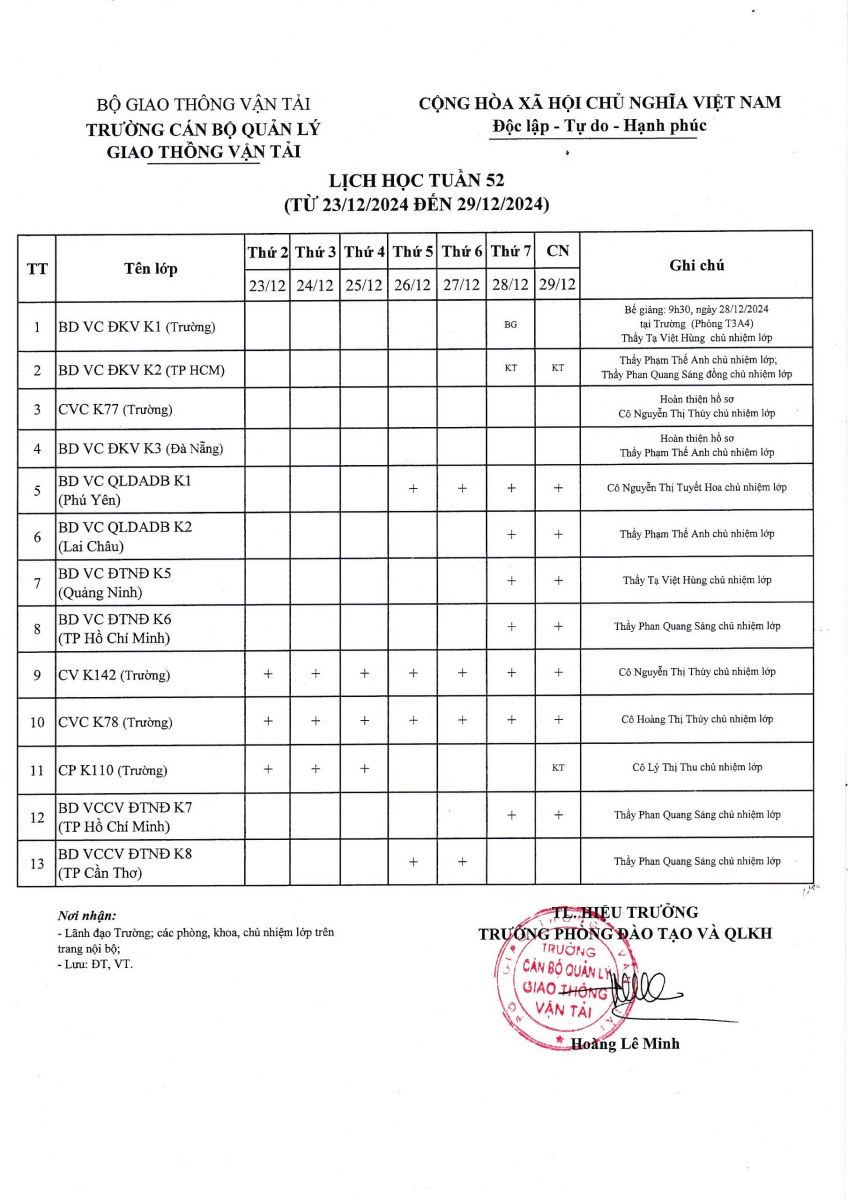 Lịch học tuần 52 từ 23/12/2024 đến 29/12/2024